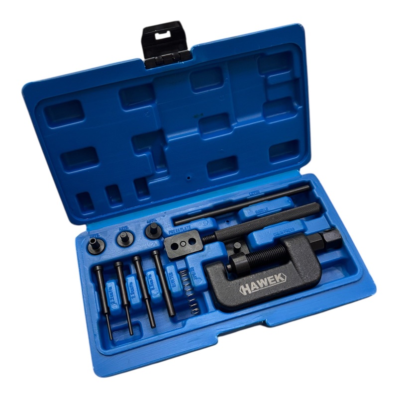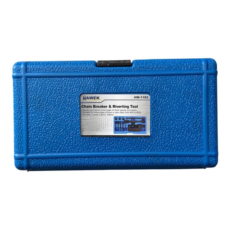 Професионален комплект за разнитване и занитване на вериги HAWEK HW-1103 намира приложение за кримпване и разкъсване на ангренажни и задвижващи вериги. Използва се в сервизи за мотоциклети, велосипеди и автомобили. Доставя се с пинове с размери 2.2 мм, 2.9 мм, 3.8 мм.