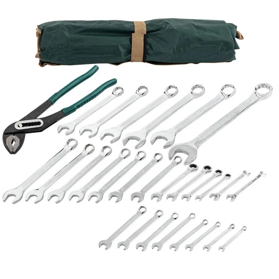 Комплектът включва звездогаечни ключове от 6 до 36 мм, тресчотни ключове, срязани ключове за спирачни тръбички, както и клещи гарги 10″ (250 мм).
