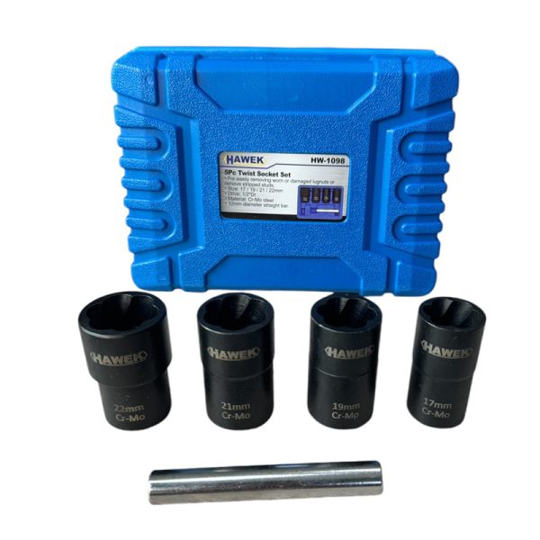 Комплекта съдържа най–използваните размери 17 мм., 19 мм., 21 мм. и 22 мм. със задвижване на 1/2″ и щифт за избиване на развития болт или гайка. Всичко това се предлага в удобна за съхранение и използване пластмасова кутия.